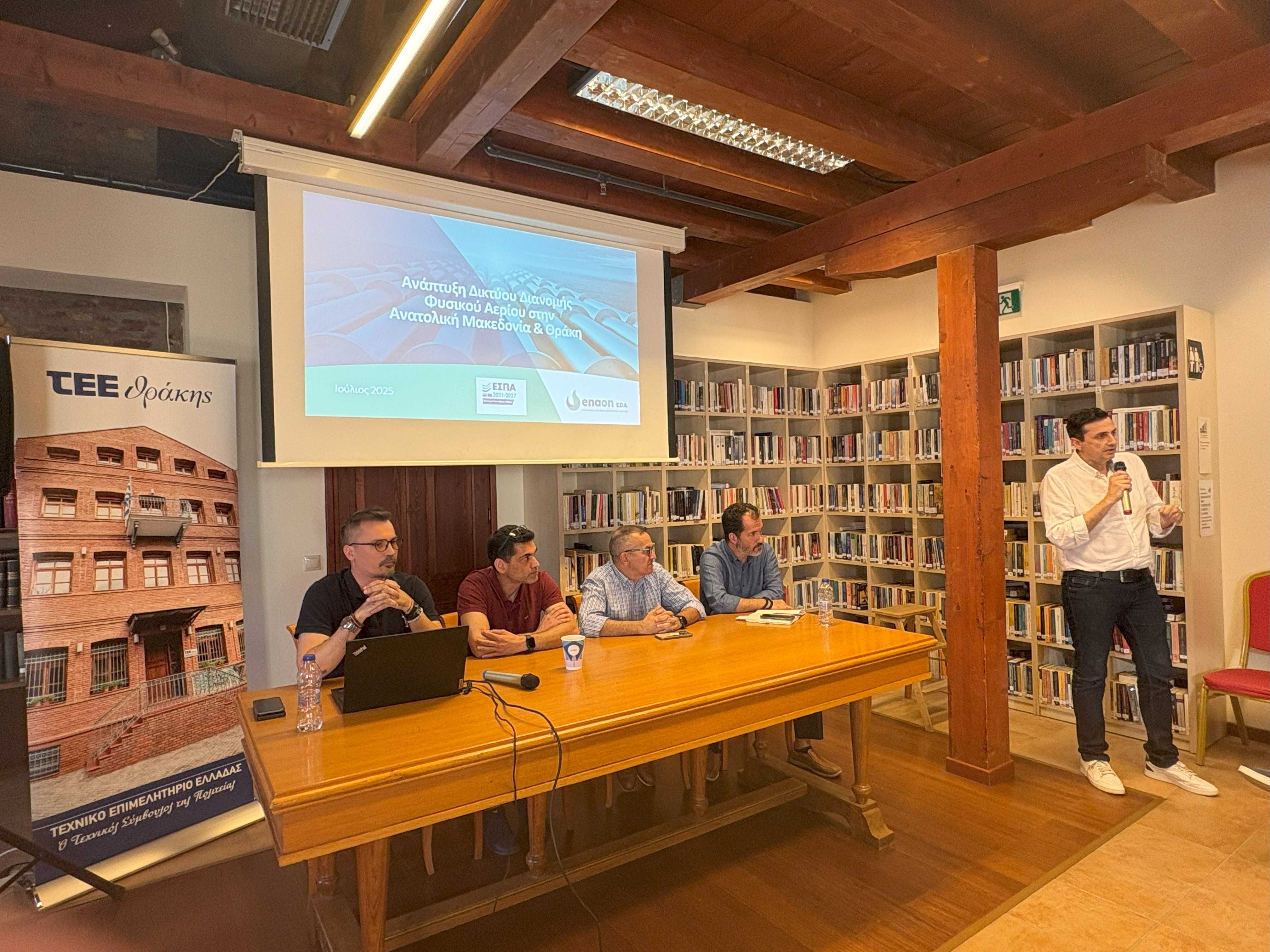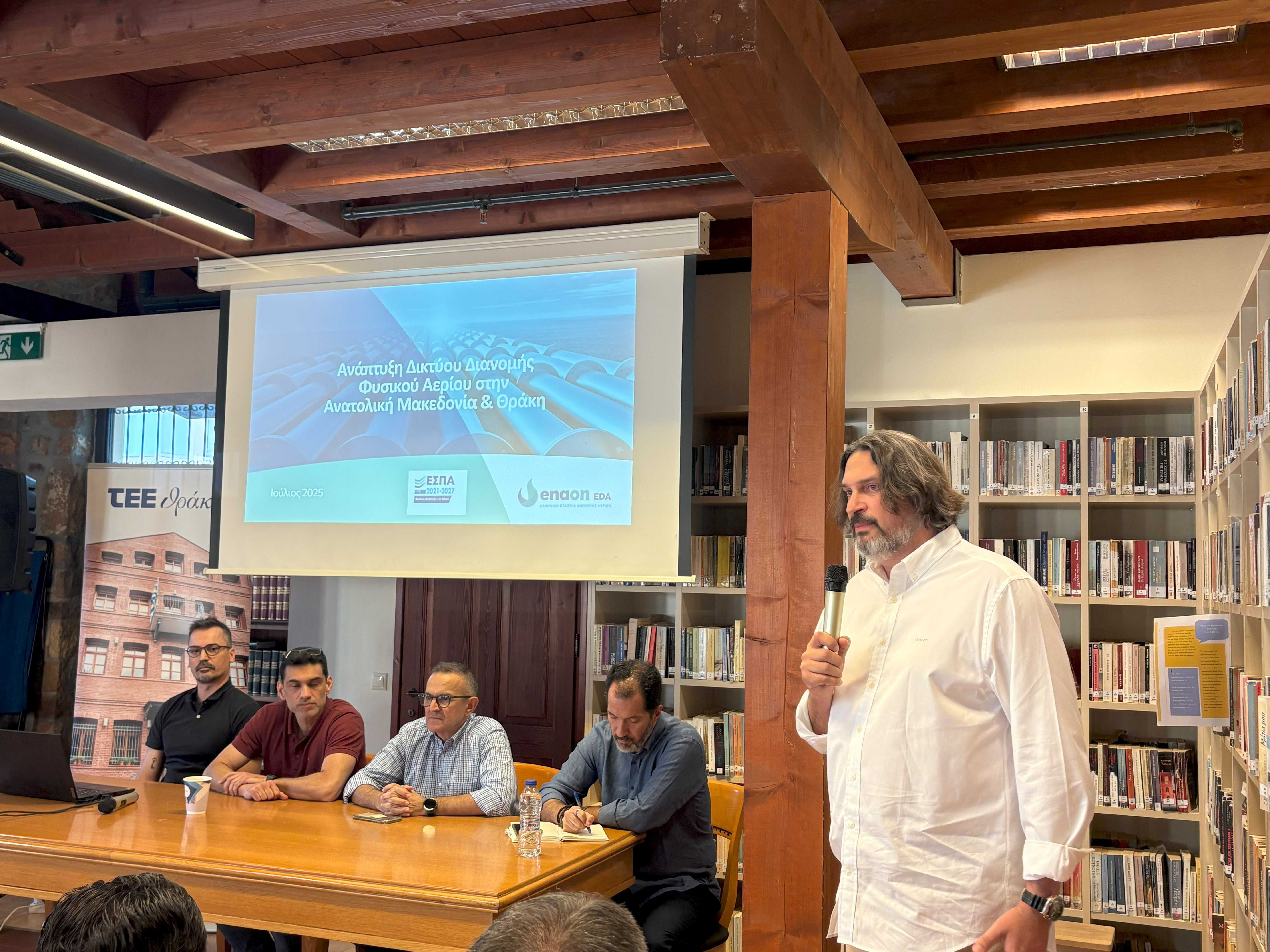 Με μεγάλη συμμετοχή πραγματοποιήθηκε η εκπαιδευτική Ημερίδα με θέμα το «Το Φυσικό Αέριο στον Έβρο», την Πέμπτη 3 Ιουλίου 2025, στο χώρο της Δημοτικής Βιβλιοθήκης (Πρώην Καπναποθήκη), στην Αλεξανδρούπολη, που συνδιοργάνωσε το Περιφερειακό Τμήμα Θράκης του Τεχνικού Επιμελητηρίου Ελλάδας με την Ελληνική Εταιρεία Διανομής Αερίων Enaon EDA.