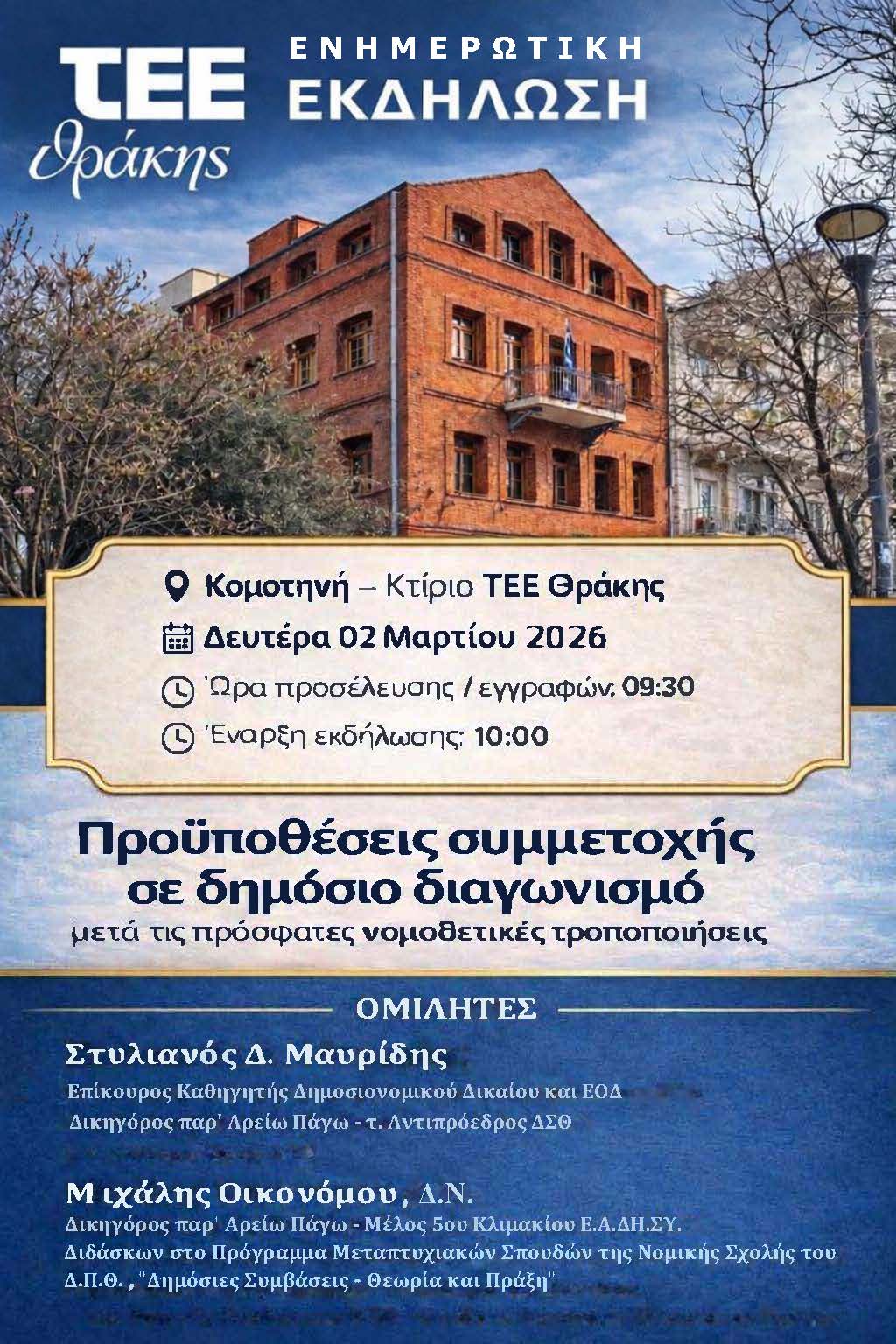 Ενημερωτική εκδήλωση ΤΕΕ-Θράκης με θέμα: «Προϋποθέσεις συμμετοχής σε δημόσιο διαγωνισμό μετά τις πρόσφατες νομοθετικές τροποποιήσεις»