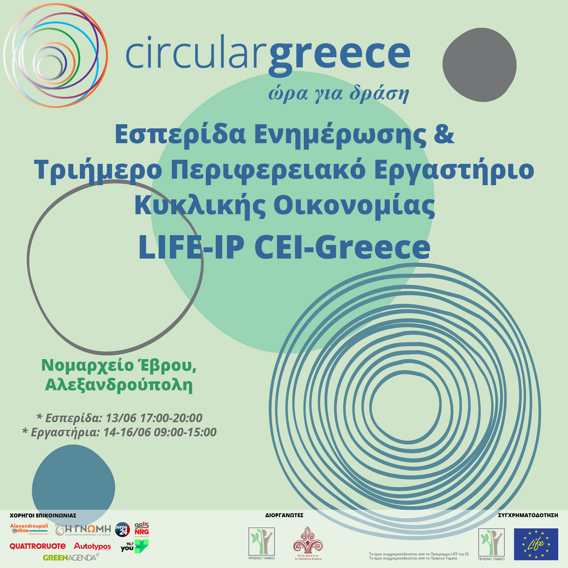 Εσπερίδα Ενημέρωσης & Περιφερειακό Εργαστήριο Κυκλικής Οικονομίας από το Πράσινο Ταμείο & την Περιφέρεια Ανατολικής Μακεδονίας & Θράκης στο πλαίσιο του Έργου LIFE-IP CEI-Greece 13-16/06/2023, Αλεξανδρούπολη