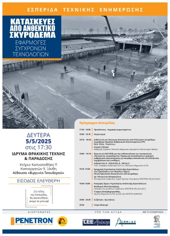 Στο πλαίσιο ενημέρωσης των μηχανικών για ανθεκτικές και αειφόρες κατασκευές, διοργανώνεται εσπερίδα με θέμα:  «Κατασκευές από Ανθεκτικό Σκυρόδεμα και Εφαρμογές Σύγχρονων Τεχνολογιών»