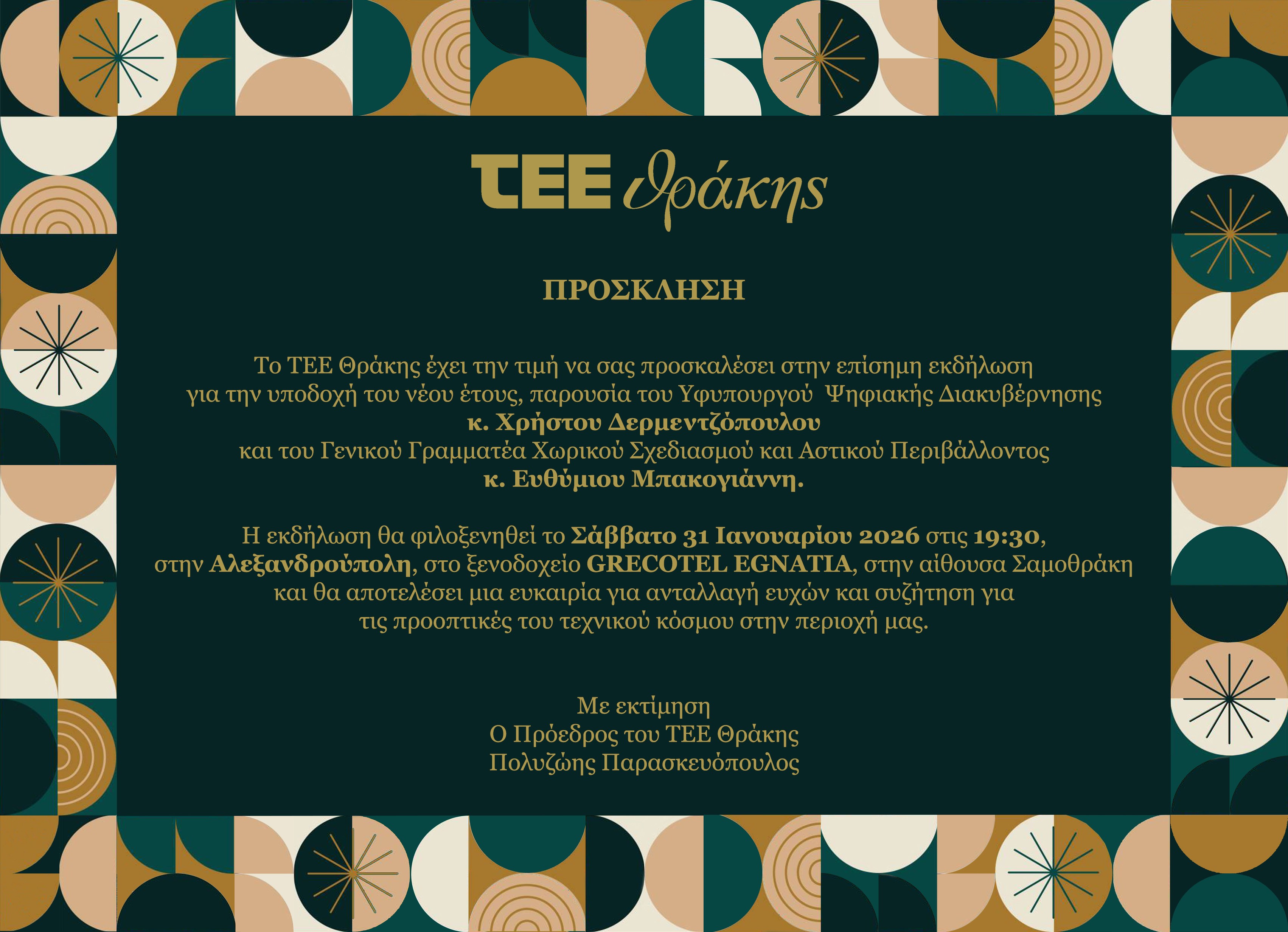 22.01.2026 ΑΝΑΚΟΙΝΩΣΕΙΣ Πρωτοχρονιάτικη εκδήλωση ΤΕΕ-Θράκης Συνημμένα αρχεία ΠΡΟΣΚΛΗΣΗ ΤΕΕ-ΘΡΑΚΗΣ_0.jpg